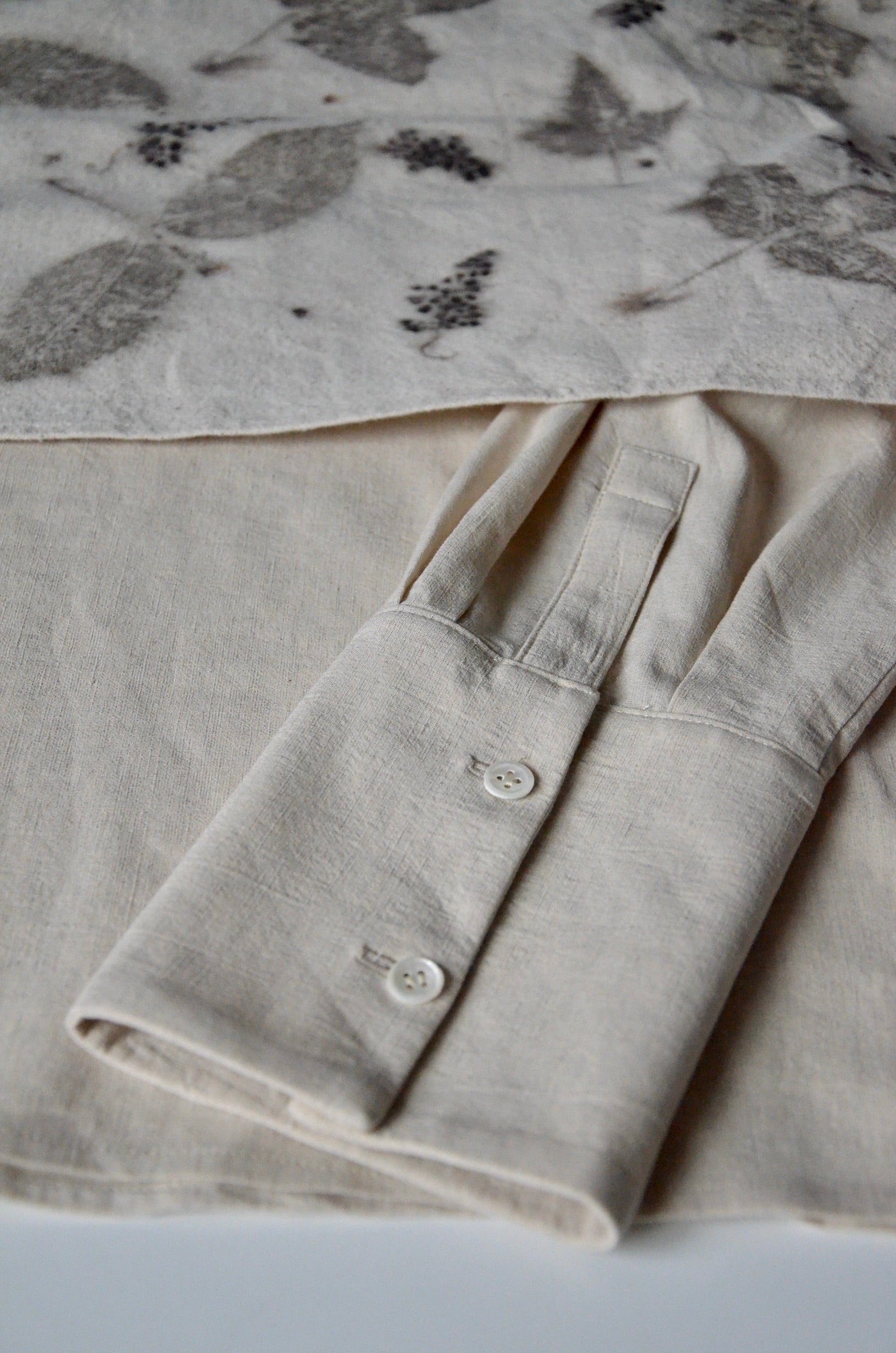 À noter que, étant imprimé à la main avec des teintures entièrement végétales, chaque tranche de 10 cm de tissu est unique. Par conséquent, chaque blouse présente des différences, et il est normal que certaines pièces présentent de légers effets de dégradé.