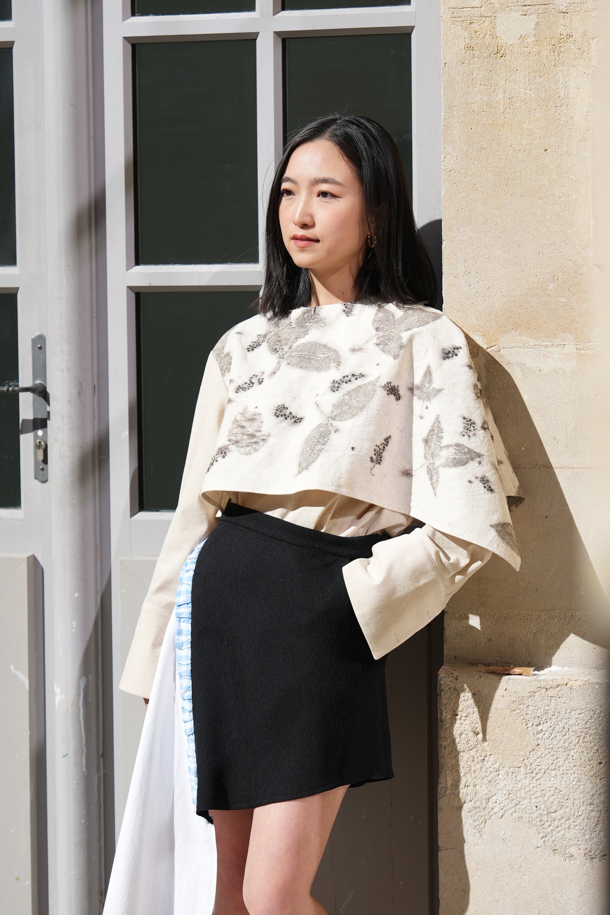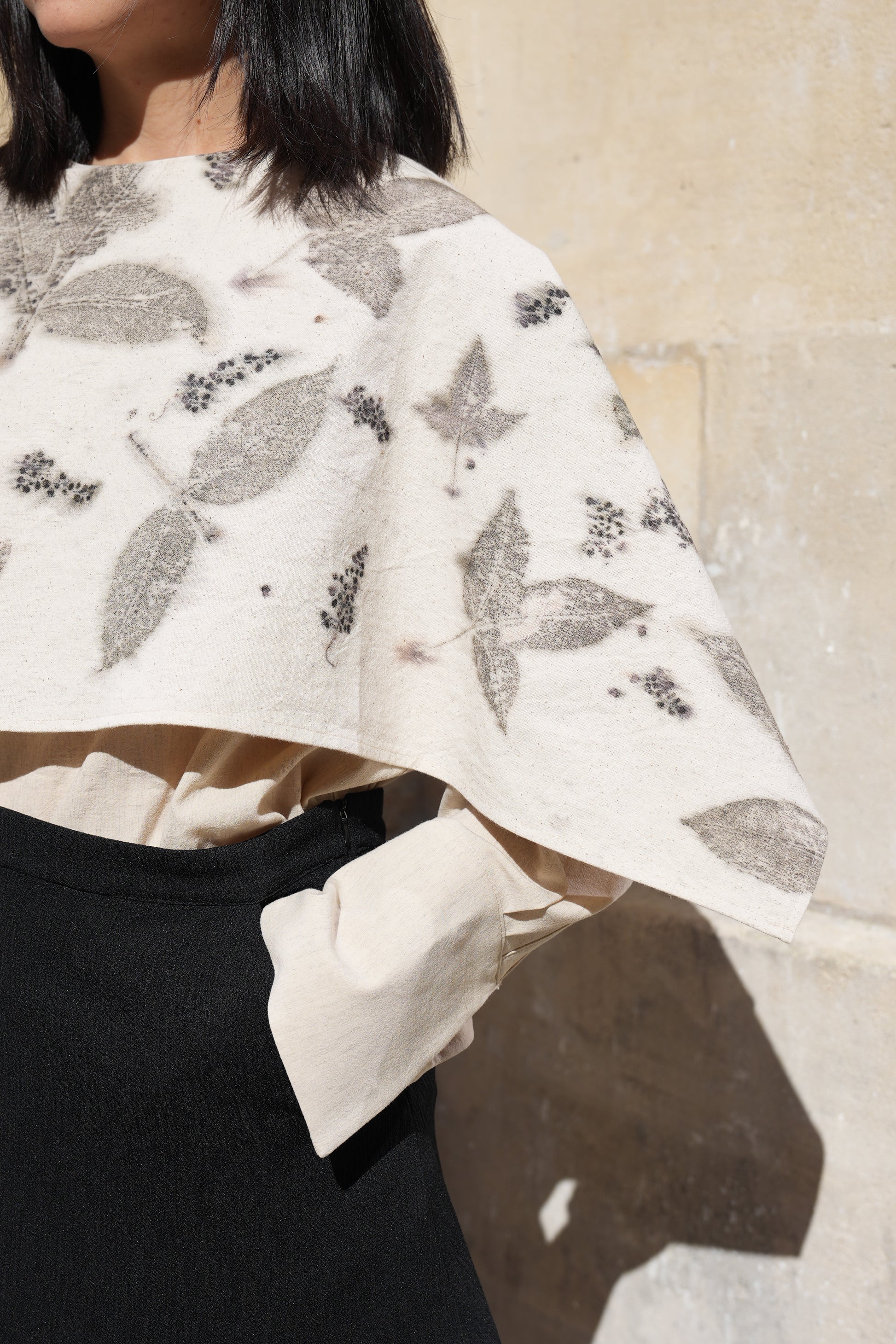 Crépuscule est une blouse de style cape. La partie cape imprimée est fabriquée à partir d'un tissu entièrement fait main, réalisé par Miao (les minorités ethniques) du Guizhou, en Chine, en utilisant des techniques traditionnelles de tissage et de teinture. Son motif a été obtenu grâce à la méthode de l’écoprint, un procédé d'impression écologique qui consiste à poser des végétaux, notamment des feuilles, sur le tissu afin d’en extraire l’empreinte colorante.